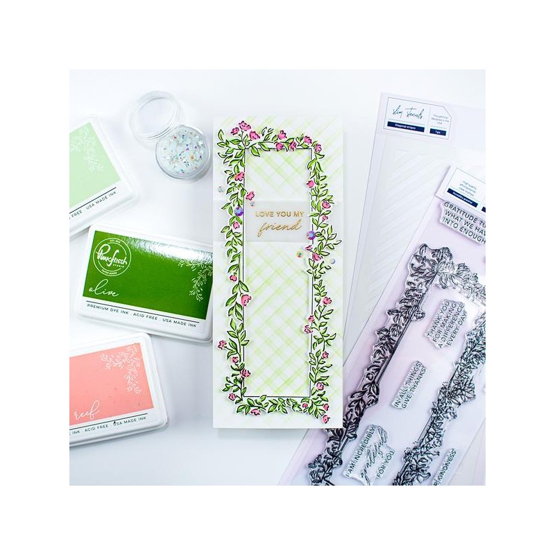 Essentials Slim Cuts are a set of basic dies to help you create gorgeous slimline cards. For reference, size #9 envelopes are for slimline cards and measure 3 7/8 x 8 7/8. We have based our die sizes on cards that will fit within the parameters of this envelope size.