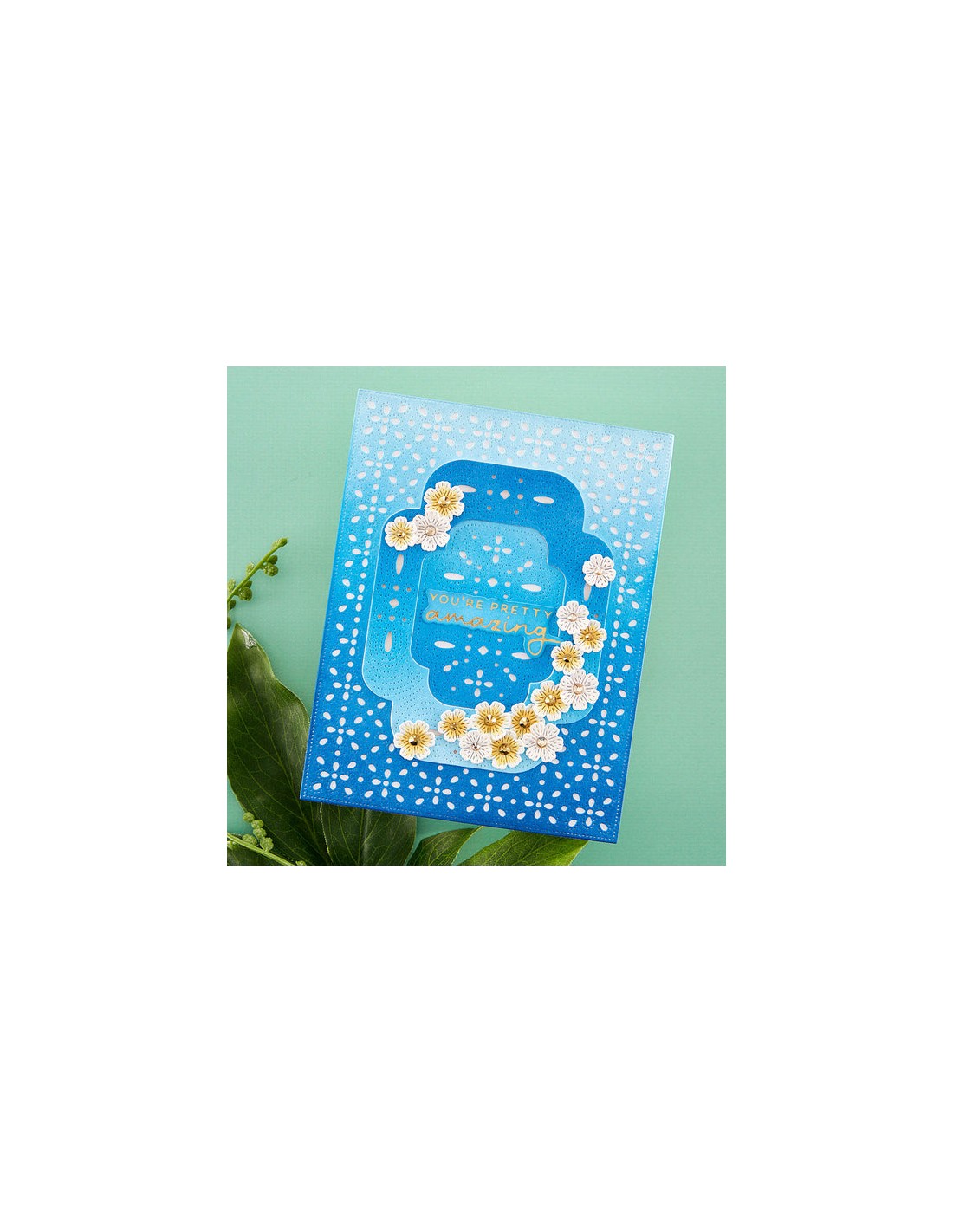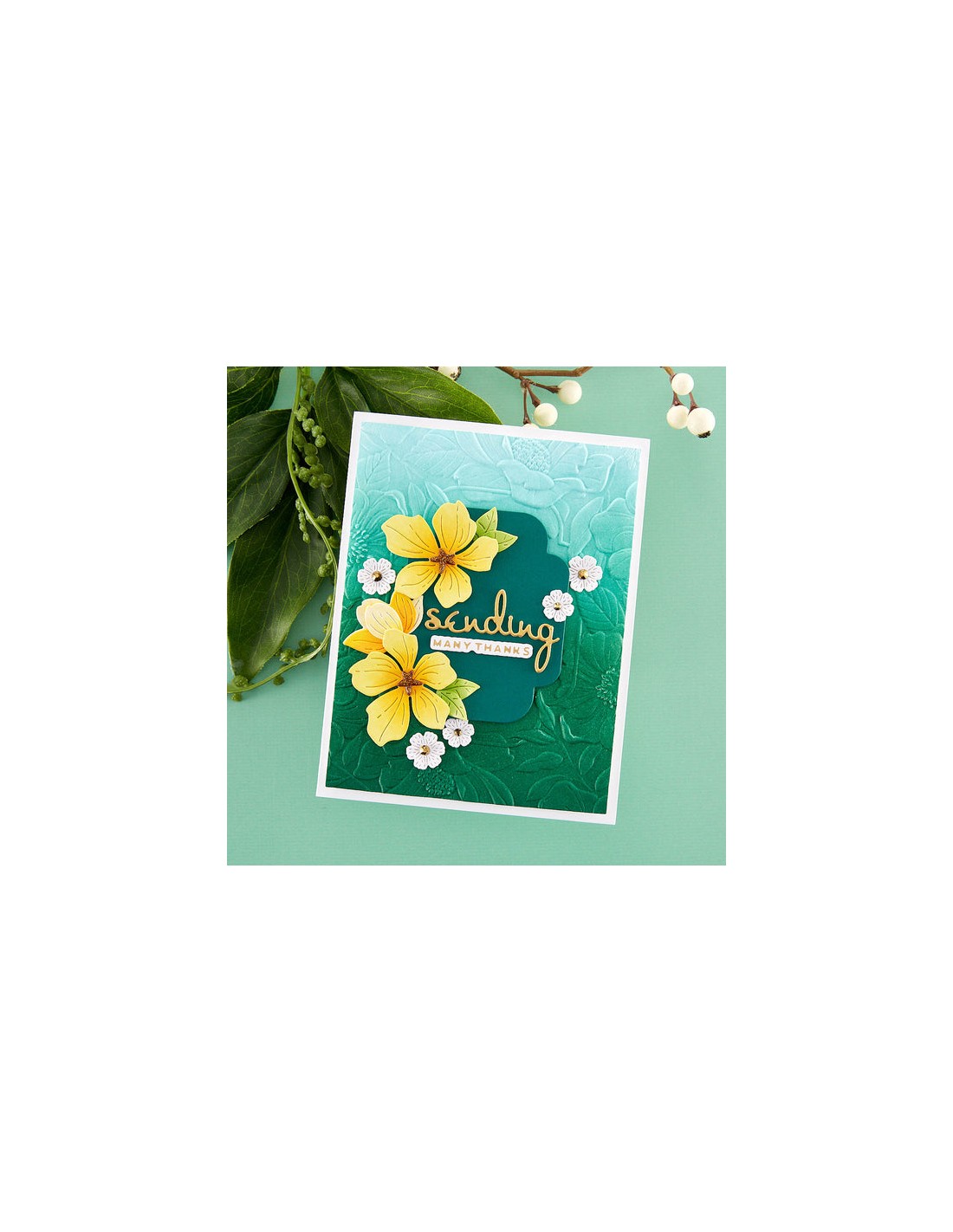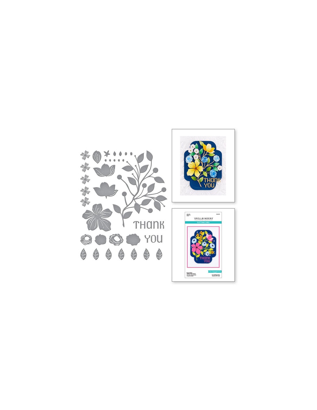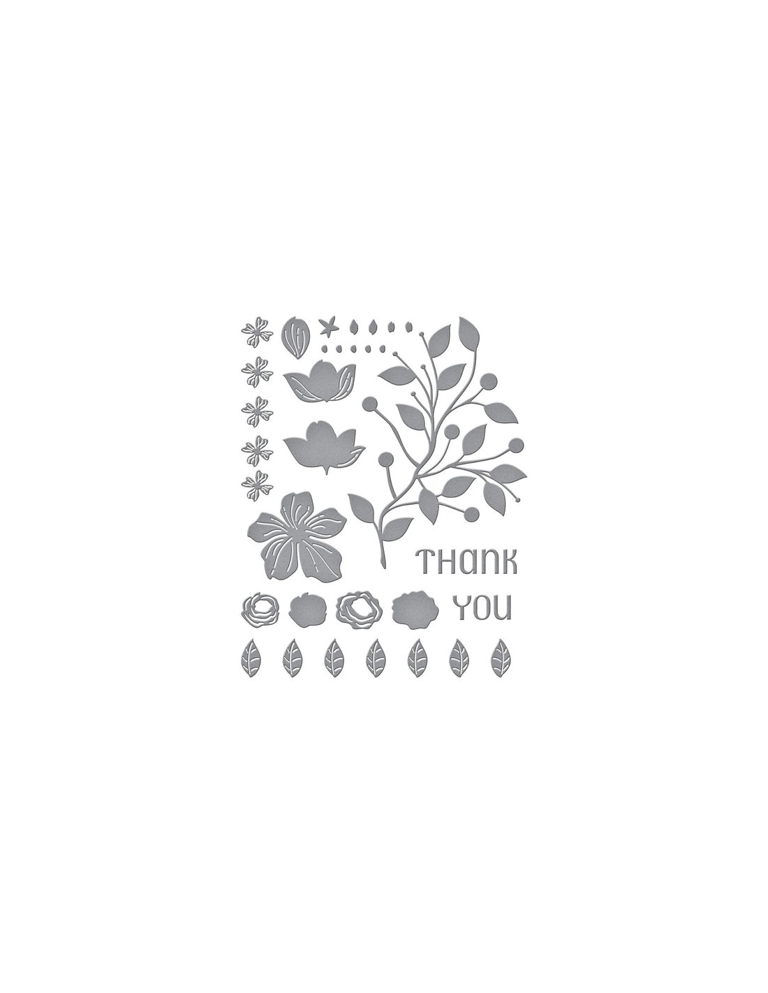 Four Petal Thank You Floral Etched Dies is part of the Four Petal Collection with a set of 12 thin metal dies. When assembled, a stunning bouquet of varied blooms with its leaf and branch accents. Included in the set: the words 'thank' and 'you' in a narrow uppercase font.
