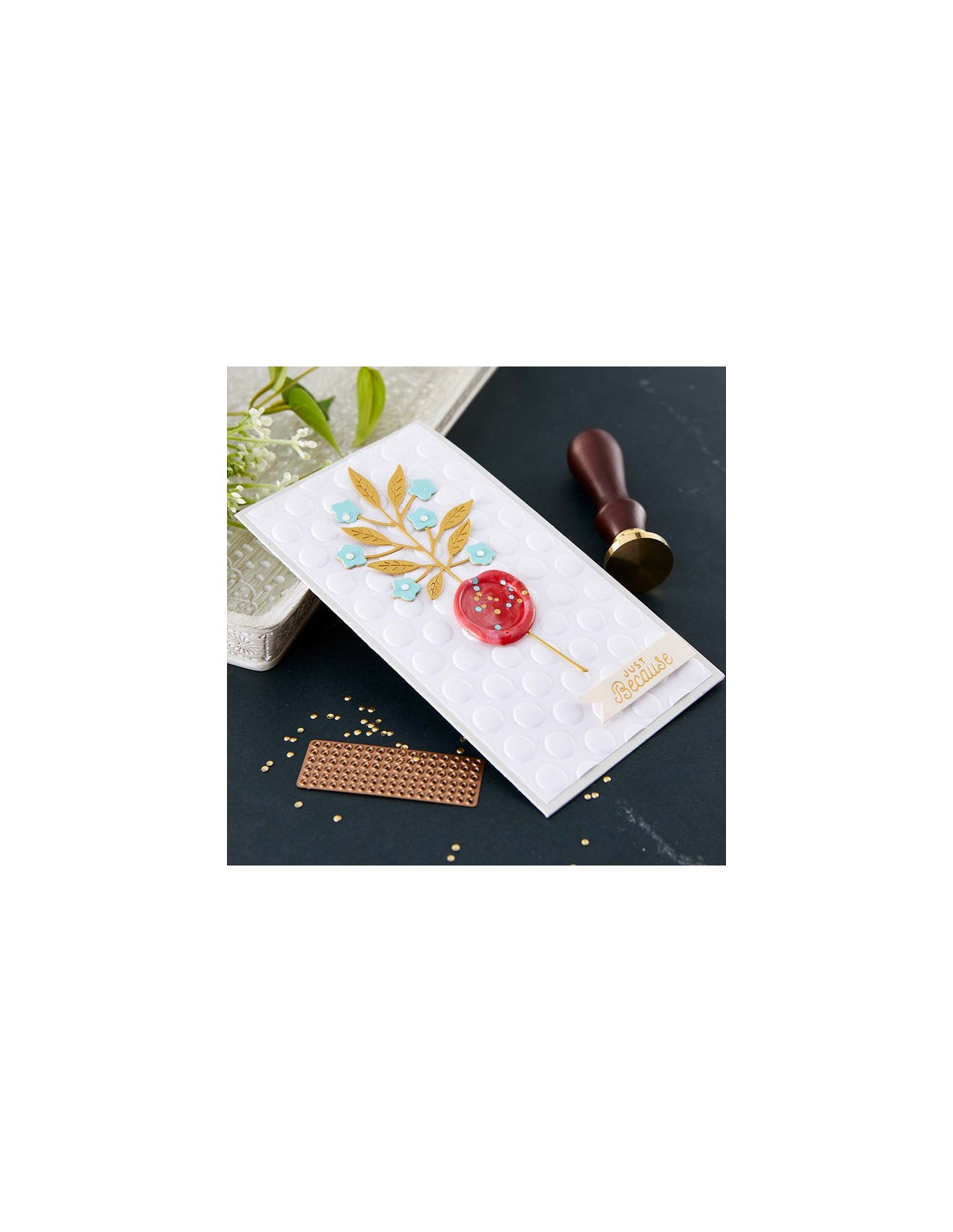 3/4” Solid Circle Wax Seal Stamp is part of the Sealed by Spellbinders Collection. It has one wooden handle that supports a round brass seal stamp design on its end. The stamp is a 0.75-inch diameter solid circle. Layer any die cut or element in the center for a unique accent. Add elegant and unique wax seal accents to your cards, envelopes and more!