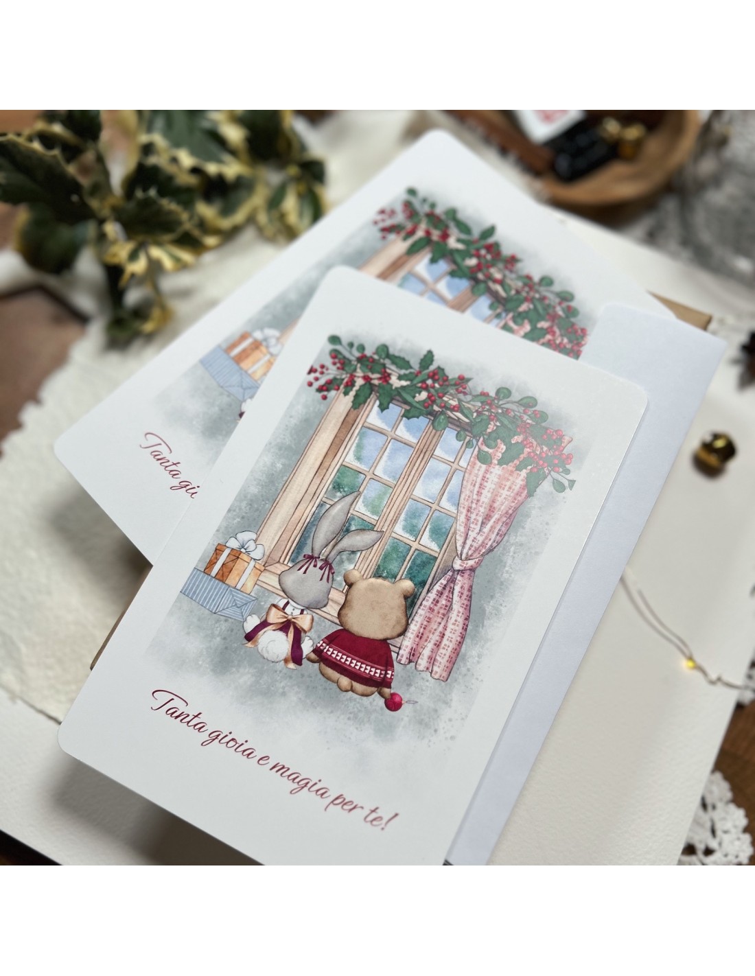 Questa deliziosa cartolina natalizia dipinta ad acquerello raffigura un tenero coniglietto e un dolce orsacchiotto seduti insieme davanti a una finestra, immersi nella magia di un paesaggio invernale. Attorno a loro, una pioggia di regali aggiunge calore e festosità alla scena. La scritta “Tanta gioia e magia per te” completa l’atmosfera incantata, rendendola perfetta per inviare auguri pieni d’affetto e dolcezza.